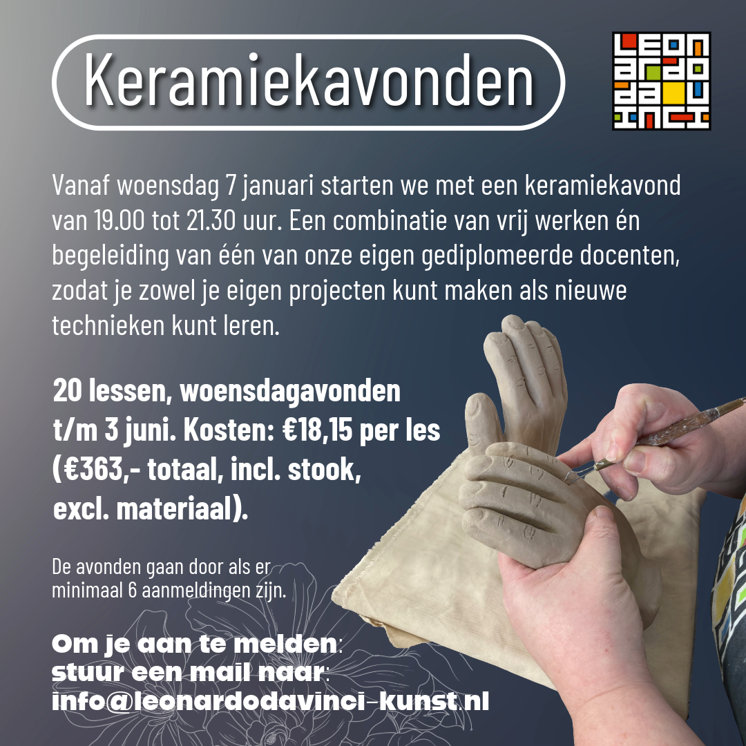 De keramiekavonden lopen t/m 3 juni 2026 en bestaan uit 20 lessen.
